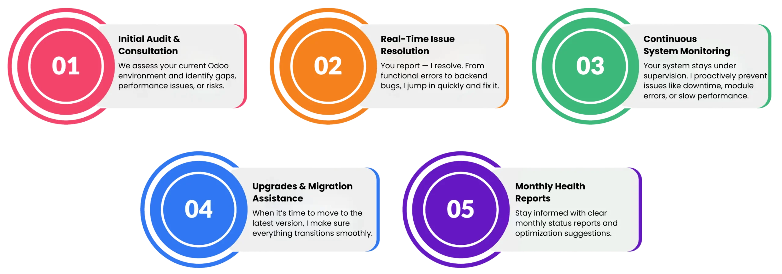Whether you're starting fresh or scaling up, these expert-led plans help you fix issues, train your team, and grow confidently with Odoo.