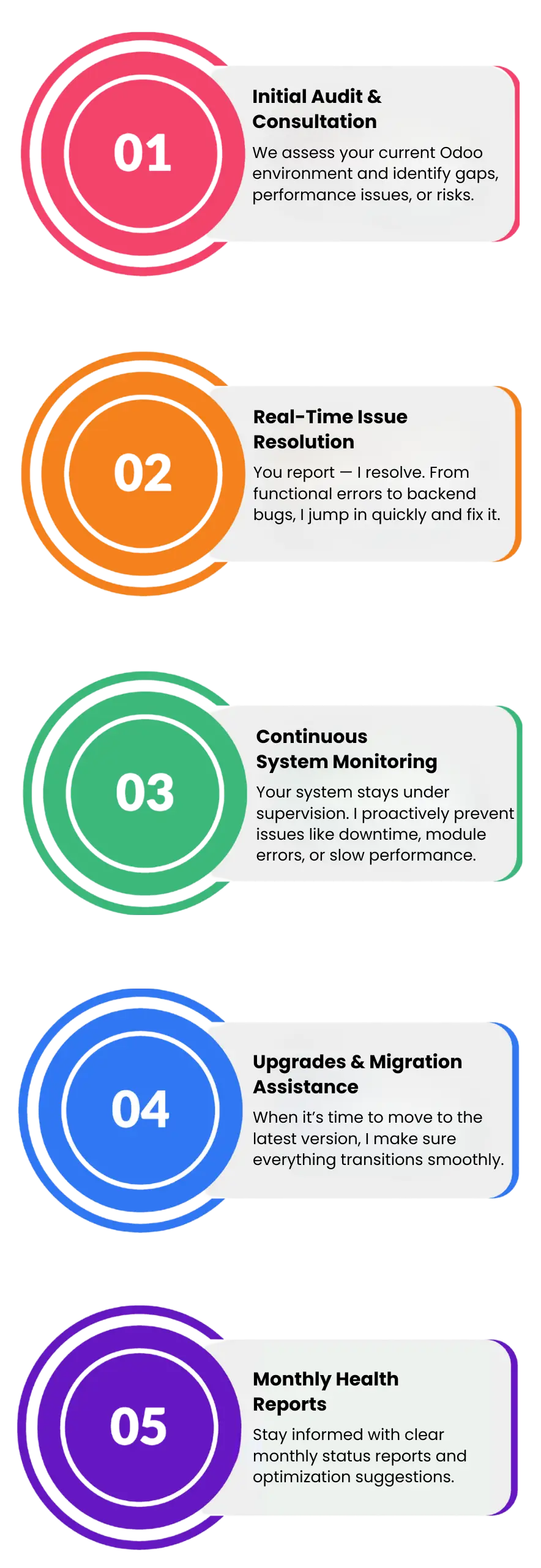 I don’t just offer support — I follow a structured process to resolve issues efficiently, guide your team through real-world use cases, and build confidence in using Odoo. Whether it's troubleshooting, upgrades, or hands-on training, this process ensures your team stays productive and your system runs smoothly.